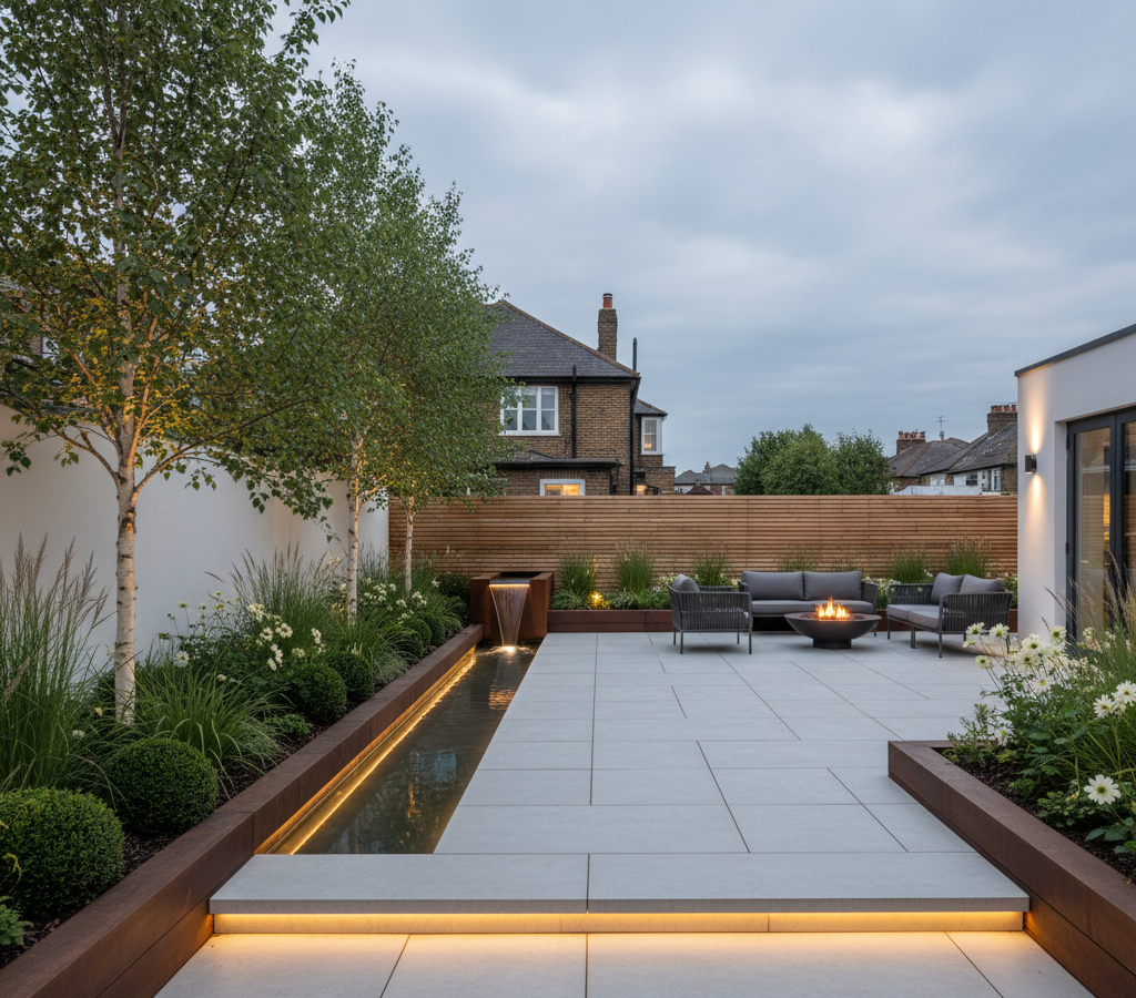 Complete garden redesign featuring modern patio, water feature, and architectural planting scheme.