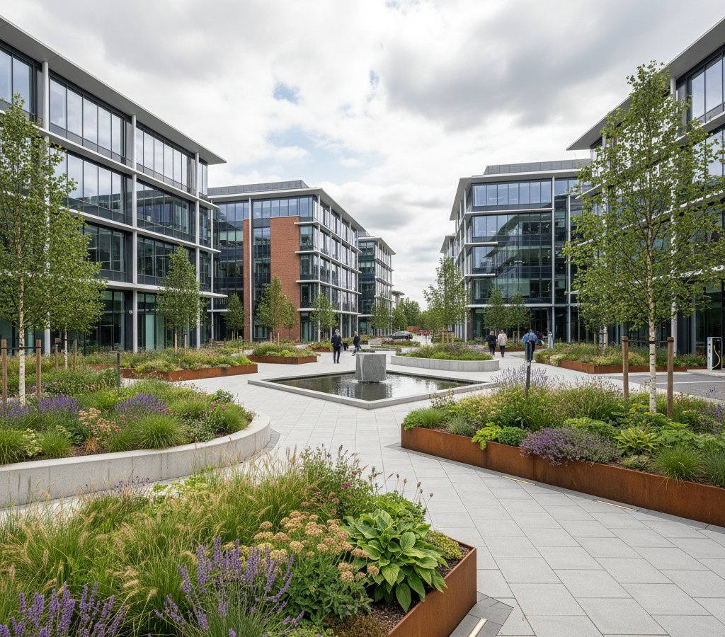 Large-scale commercial landscaping with sustainable planting and low-maintenance design.