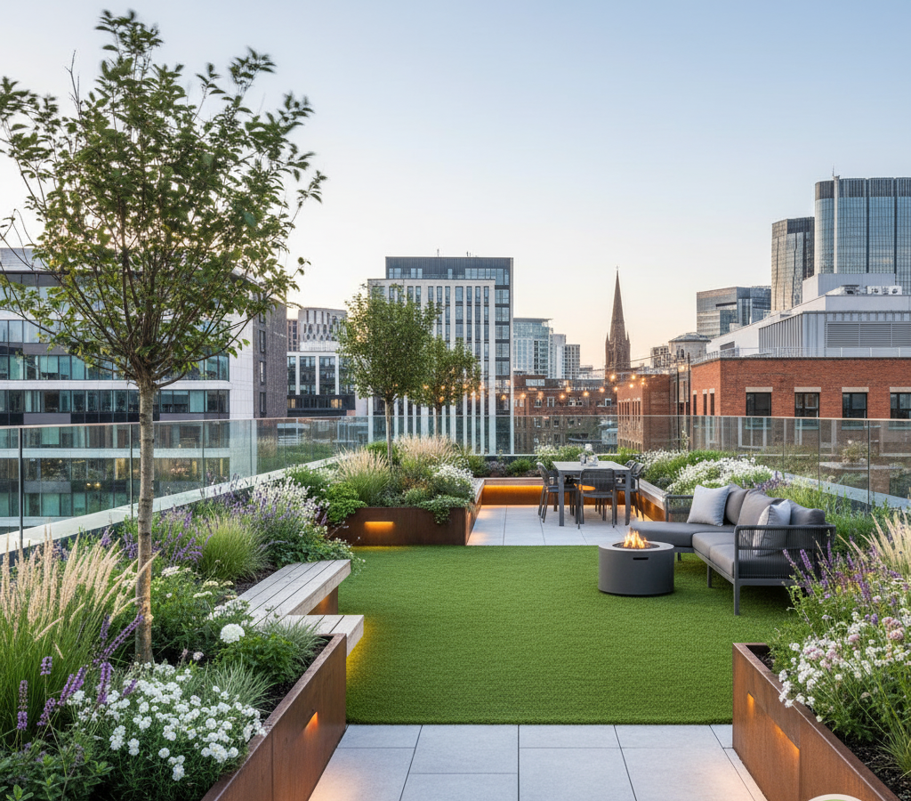Innovative rooftop garden design maximising limited space with raised beds and artificial lawn.