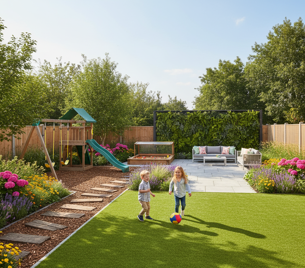 Child-friendly garden with safe play areas, durable surfaces, and colourful seasonal planting.